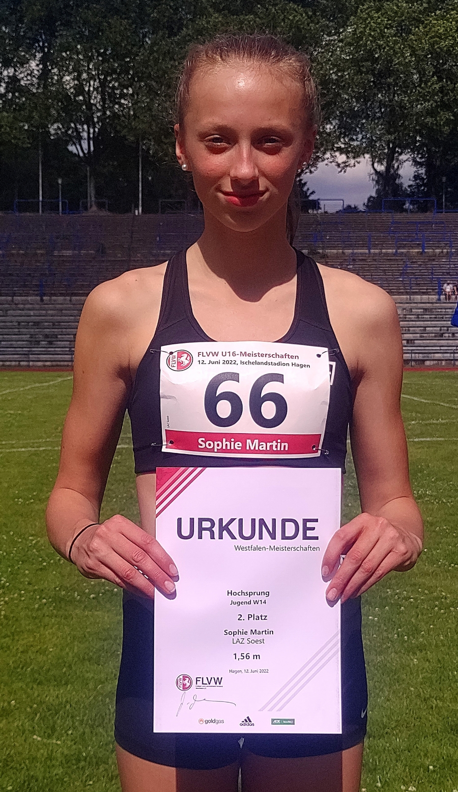 Zwei Platzierungen auf dem Treppchen, mehrere persönliche Bestleistungen und jede Menge Wettkampferfahrung – das ist die Ausbeute, mit der die Nachwuchs-Leichtathleten des LAZ Soest von der Westfalenmeisterschaft in Hagen zurückkehrten. Erfolgreichste LAZ-Sportlerin im Ischelandstadion war Hochspringerin Sophie Martin. Bei ihrer ersten Freiluft-Westfalenmeisterschaft gewann sie den Vizetitel in der Altersklasse W14. Bei den Titelkämpfen in der Halle landete sie im März noch auf dem vierten Platz. Mit übersprungenen 1,56 Metern blieb Martin nun vier Zentimeter unter ihrer persönlichen Bestleistung und musste sich nur der neuen Westfalenmeisterin Nele Kasberg (1,59 Meter) von der TSG Dülmen geschlagen geben. „Sophie hat sich sehr gut präsentiert und einen tollen Wettkampf abgeliefert“, lobte LAZ-Trainer Harald Bottin. In der Westfälischen Bestenliste steht die talentierte LAZ-Sportlerin weiterhin auf Platz eins und auch bundesweit zählt sie zu den Top Ten in ihrer Altersklasse.