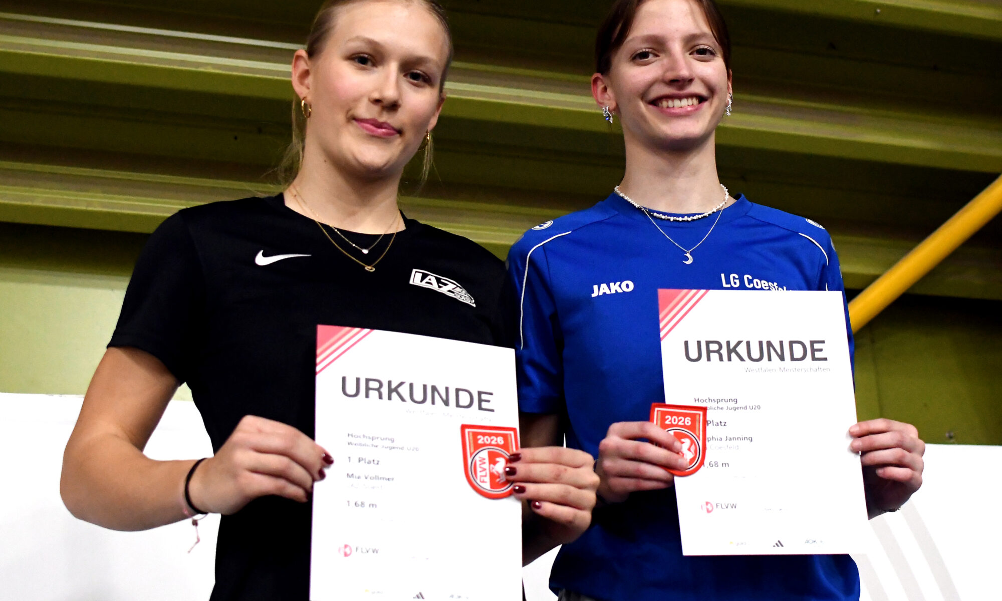 Wenige Stunden zuvor hatte sein Vereinskamerad Michel Bottin schon zum ersten Mal für Freude im Soester Team gesorgt Der M14-Athlet wurde seiner Favoritenrolle im 60-Meter-Hürdensprint gerecht, besaß im Finale aber mit Dauerkonkurrent Leonas Czeranka vom TV Werne einen starken Gegner, der ihn voll forderte. Im Ziel lag Bottin in 9,58 Sekunden genau 8 Hundertstel vor Czeranka, der den Soester vor einem Jahr bei den Titelkämpfen der U14 in Paderborn um eine Hundertstel besiegen konnte. Einen Tag später gewann der Archigymnasiast noch einen weiteren Titel. Im Stabhochsprung meisterte er 2,70 Meter und nahm gemeinsam mit Konrad Marcus von der LG Brillux Münster, der ebenso, ohne vorherigen Fehlversuch die gleiche Höhe schaffte, Urkunde und das Meisterschaftsabzeichen mit dem Westfalenpferdchen entgegen. Das vierte Gold für das LAZ Soest ging an U20-Athletin Mia Vollmer, die wie schon drei Wochen zuvor in Clarholz erneut im Hochsprung 1,68 Meter überflog und erst an der DM-Qualifikationshöhe von 1,71 Metern scheiterte. Wie Bottin beim Stabhochsprung, gab es auch hier am Ende zwei Siegerinnen. Auf der obersten Stufe des Siegerpodestes freute sich die Scheidingerin zusammen mit Sophia Janning von der LG Coesfeld über den Titelgewinn.